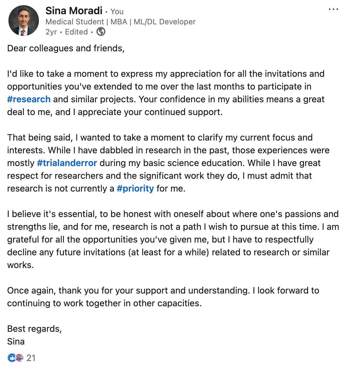 before diving into the main subject, i want to mention that before this time, i had some research experiences, especially four years ago when i joined teams in our university and other universities and societies in the country that were writing systematic reviews (also known as "research" here). but, i’m grateful that those works didn't go as they were planned, and almost nobody followed up on them. :) this made me think that research was a total waste of time, nobody cares enough, and everybody is doing it to have a “paper”, and i prefer to do some "real" work. i also wrote a linkedin post to notify my colleagues that i’ll not accept research opportunities, respectfully. :) here is that post: